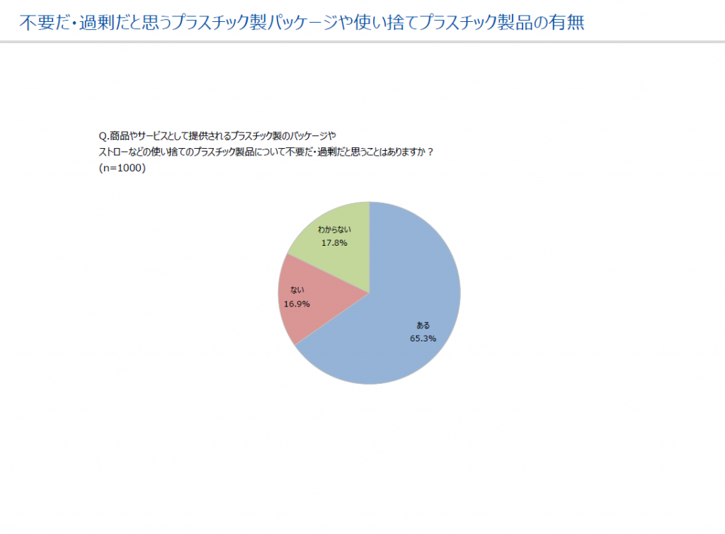 株式会社マクロミルの調べ(https://honote.macromill.com/report/20181023/)によると、プラスチック製の包装や使い捨て容器について、65%以上の人が不要・過剰だと思っており、思わないの16.9%を大きく上回っています。