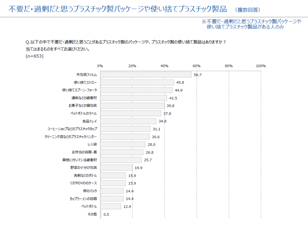 また、不要・過剰だと思う製品についての回答では、『外包装フィルム』がもっとも多く56.7%。次に多いのが『使い捨てストロー』、その他『使い捨てスプーン・フォーク』や『通販などの緩衝材』が40%を超えた回答になっています。
