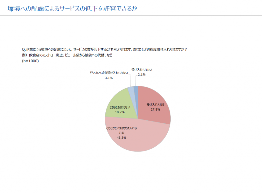 最後に、『企業の環境配慮によりサービスの質が低下することを受け入れるか』との問いには、27.8%が『受け入れる』。48.3%が『どちらかというと受け入れる』と回答し、大多数は肯定的であると言えます。