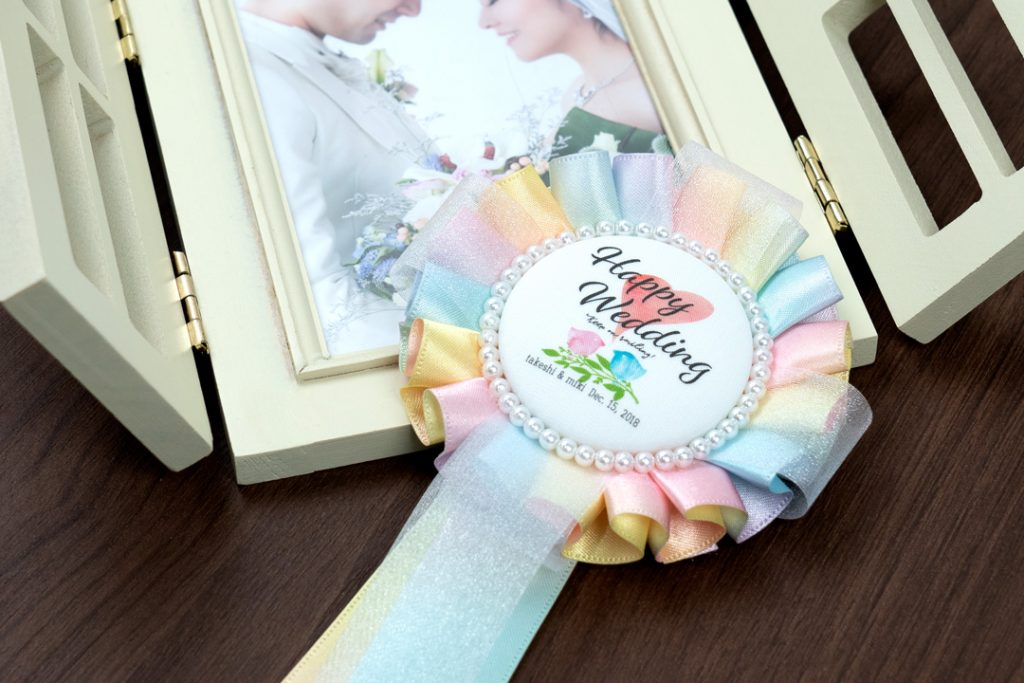 プリーツ状のリボンに縁取られた華やかさが印象的で、祝いの場に最適なアイテムです。最近では日本でも結婚式等でゲストの名前を入れて席札として使うなど見かける機会が増えてきました。