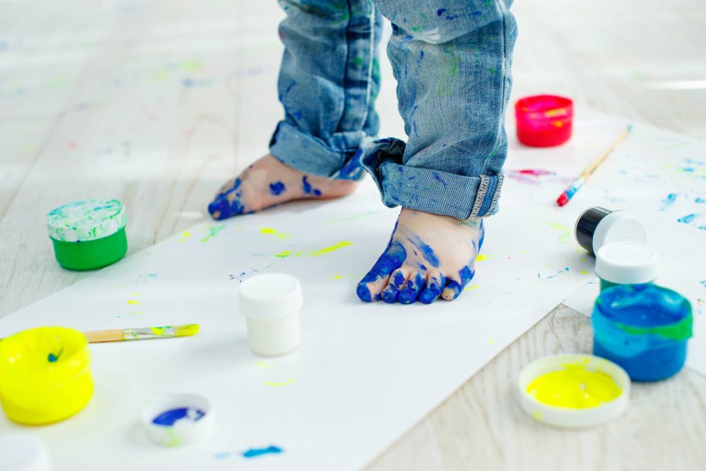 ①足裏に絵の具またはスタンプを塗って、画用紙に押す