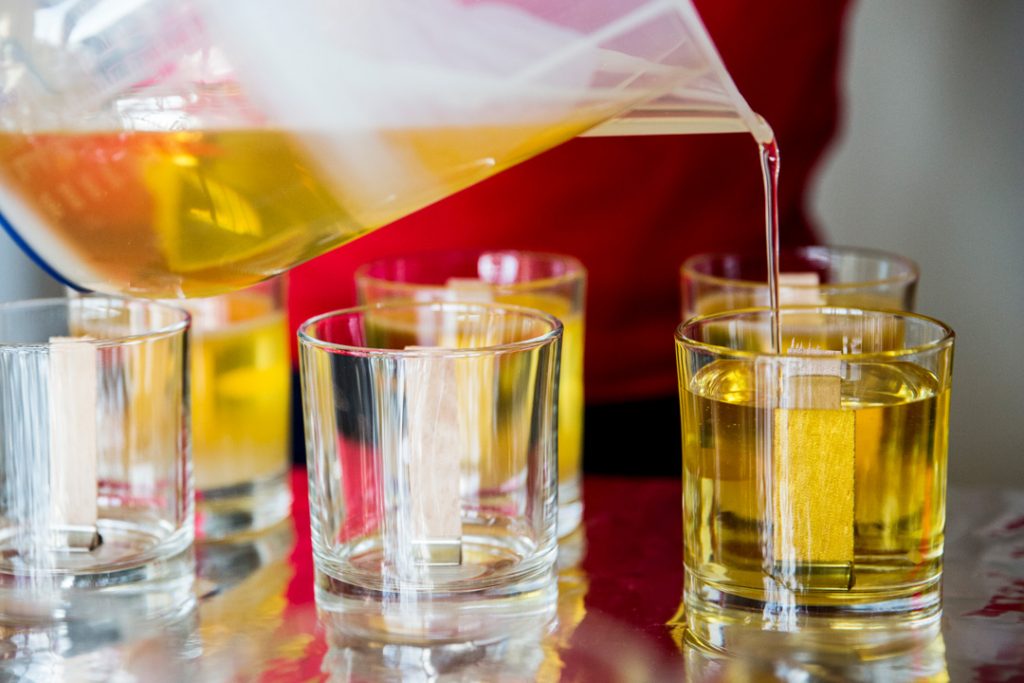 - 芯をセットした容器に、溶かしたソイワックスをゆっくりと注ぐ。