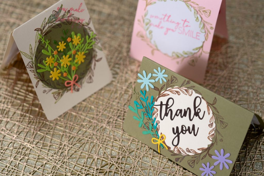 例えば、繊細なカットが美しい【THINLITS(シンリッツ)】。これは薄い金属製の抜き型で、切り抜き可能な対象が紙に限定されますが、手作業では不可能のような非常に細かく美しいカットに仕上がるのが特徴です。また種類も多く組み合わせの自由度が高いのも使い道が広がって良いですよね。メッセージカードや写真と【SIZZIX シジックス シンリッツ ダイセット [フローラルレイヤー]】を組み合わせれば、手作りとは思えない繊細な装飾が可能です。