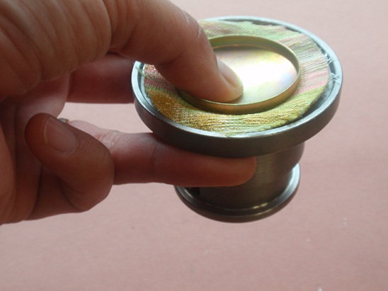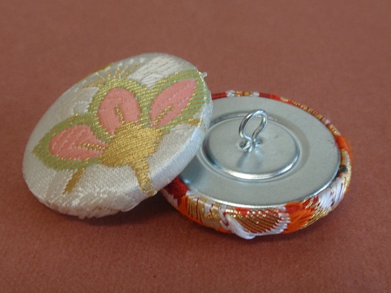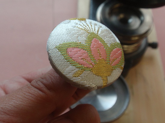 通常のくるみボタンは、シェルとバックパーツの間に布を挟み込みますので、